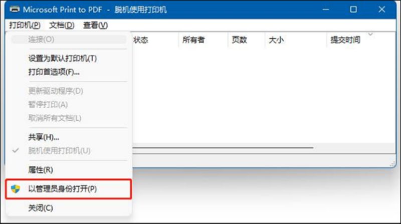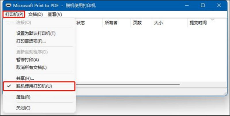 6、看到這個如下界面后,點(diǎn)擊左上角“打印機(jī)”菜單,檢查“脫機(jī)使用打印機(jī)”選項(xiàng)是否處于勾選狀態(tài),如果是,則取消即可