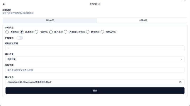 本軟件支持多種去水印方式,適用于不同水印類型的PDF。