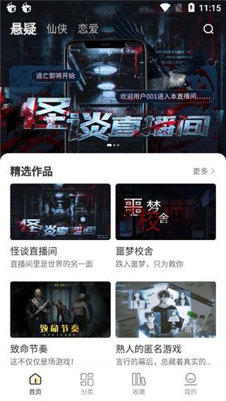 1、在本站下載軟件后打開(kāi)并登錄,在首頁(yè)上可以看到有懸疑、仙俠、戀愛(ài)等題材小說(shuō)