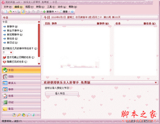 快樂女人好幫手是集通訊錄、日程安排、任務(wù)計(jì)劃、公歷農(nóng)歷、電子日記、便箋備忘、密碼管理、網(wǎng)址收藏等諸多功能于一身的個(gè)人信息管理軟件。軟件具有集成化的界面,統(tǒng)一的操作方式。您無(wú)需分別打開幾個(gè)不同的程序來(lái)管理您的個(gè)人事務(wù)。