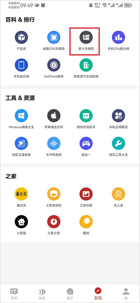 1、在發(fā)現(xiàn)界面中為用戶提供了百科排行、工具資源、之家三大類功能,在百科排行功能中點(diǎn)擊顯卡天梯圖。