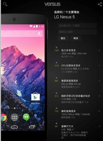 VERSUSIO的消費(fèi)者借助這一平臺(tái)核對(duì)電子產(chǎn)品,例如GalaxyS4和iPhone5。除開(kāi)常用的硬件配置大比拼外,VERSUSIO不容易漏了表明GalaxyS4可以播放Flash而iPhone5不行,也不會(huì)漏了說(shuō)明iPhone5顯示屏每一個(gè)清晰度有三個(gè)詳細(xì)的子清晰度,表明實(shí)際效果更為細(xì)致與鋒利。