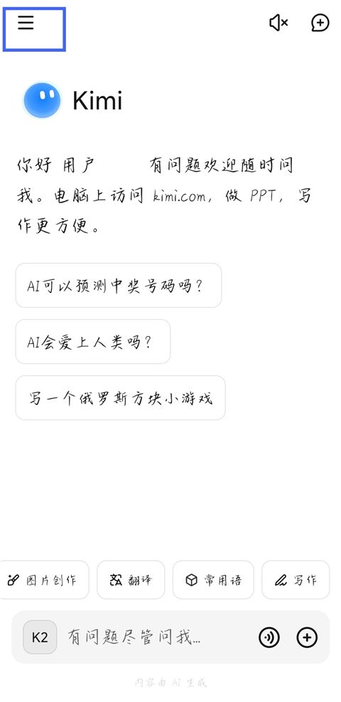 1、打開kimi智能助手,點擊左上角三橫線標識。