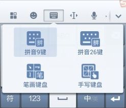 在頂部快捷工具欄點擊左邊第二個切換鍵盤按鈕,即可進行輸入法切換菜單,選擇想要的輸入方式和鍵盤樣式:拼音9鍵、拼音26鍵、筆畫和手寫.
