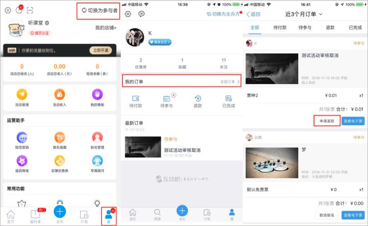 1、打開(kāi)App,登錄成功后→“我”→頂部點(diǎn)擊“切換為參與者”→點(diǎn)擊“全部訂單”→點(diǎn)擊某一活動(dòng)下方的“申請(qǐng)退款”即可。