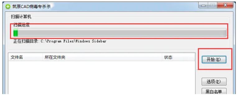 1、打開筑原CAD病毒專殺條件,點(diǎn)擊開始,等待進(jìn)度條走完