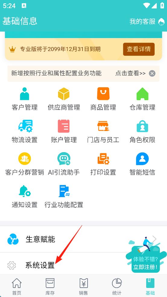 1、點(diǎn)擊秦絲生意通app右下角的“基礎(chǔ)”。