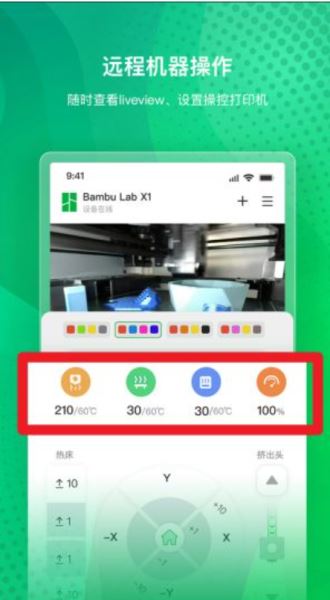 2、通過(guò)遠(yuǎn)程操作功能,用戶可實(shí)時(shí)查看打印狀態(tài),并遠(yuǎn)程調(diào)整噴嘴溫度、熱床溫度等關(guān)鍵打印參數(shù)。