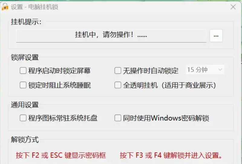 在電腦設置中,我們可以進行多項操作,如 啟用掛機提示功能,同時還可以設置程序啟動時的屏幕鎖定以及無操作情況下的自動鎖定等安全選項。此外,我們還可以進一步探索電腦設置中的其他功能,例如設置透明或半透明的鎖屏效果,這些功能都相當簡單易懂,無需過多介紹。