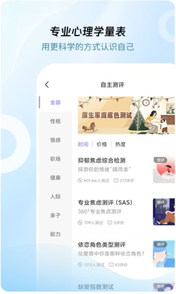 內(nèi)置多種心理測評量表,涵蓋焦慮、抑郁、壓力、人際關(guān)系等多個(gè)方面。用戶可通過測評了解自身心理狀態(tài),為尋求幫助提供依據(jù)。