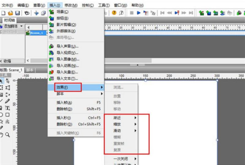 在工具欄中中我們要認(rèn)識六個插入按鈕和三個播放按鈕,五個插入按鈕分別插入場景、文本、圖片、內(nèi)容、按鈕和精靈,三個播放按鈕分別播放影片、時間線及各個特效的動畫效果。