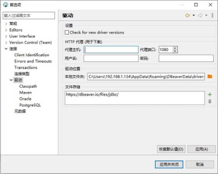打開工具欄上的“窗口” - “首選項(xiàng)” - “連接” - “驅(qū)動”,設(shè)置HTTP代理,如下圖。