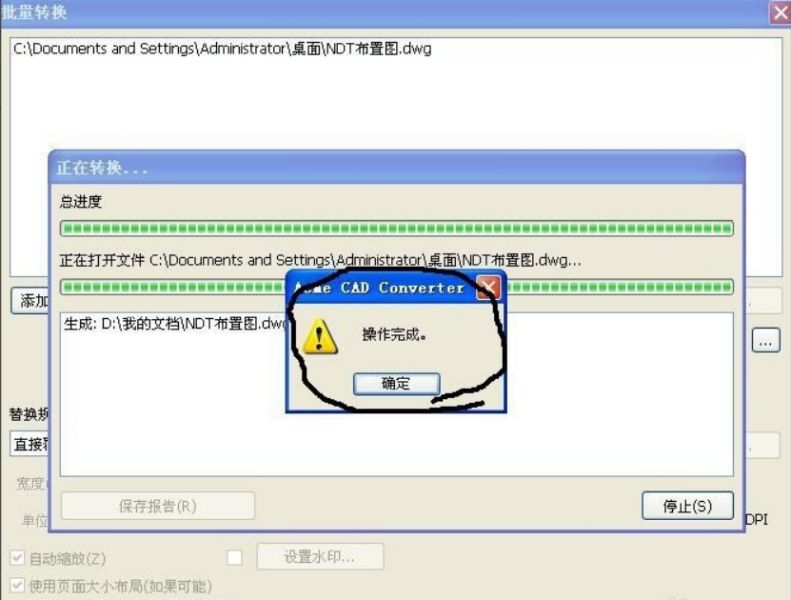 第五步,點擊了開始轉換之后,你就可以耐心等待轉換的進度條完成了。等待出下線圖中的界面時就表明已經(jīng)轉換完成,點擊彈出的確定選項,然后就可以在你設置的保存位置找到轉換后的文件了。接下來用你的CAD打開,便可成功能打開。整個版本轉換過程完成。