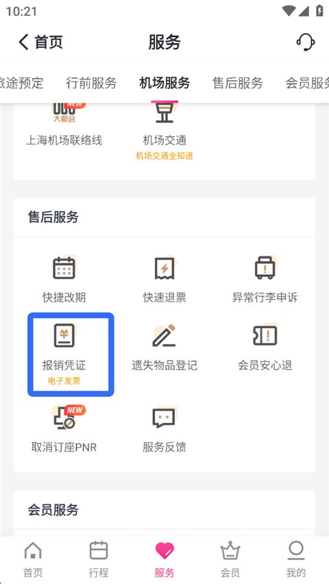 1、吉祥航空app,在【服務(wù)】界面點擊【報銷憑證】。