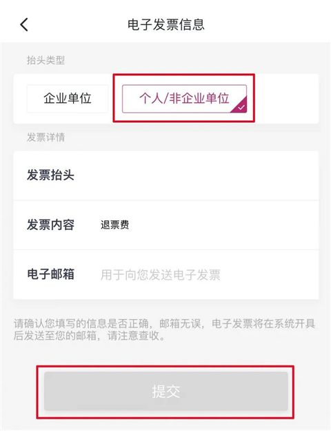 4、然后跳轉(zhuǎn)信息填寫頁,選擇個人/企業(yè)抬頭類型,填寫開票信息后點擊【提交】。