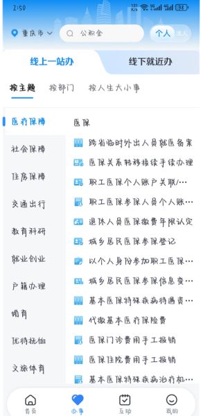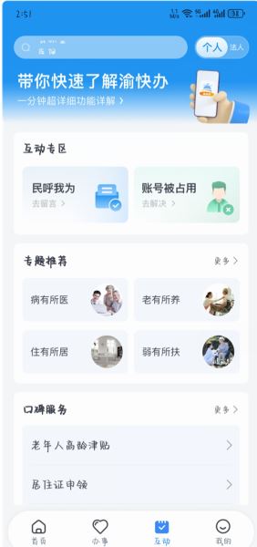 2、渝快辦,包含了幾大重點功能區(qū)域,為用戶展示重點事項、信息通告、服務專區(qū)、新上線服務和個性化服務。
