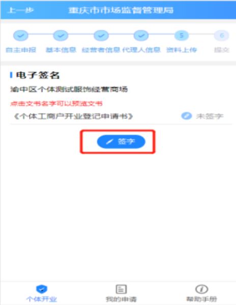 如果當前經(jīng)辦人是經(jīng)營者本人,直接點擊簽字 ,跳轉(zhuǎn)到如下圖界面,點擊簽字,完成后續(xù)簽字即可