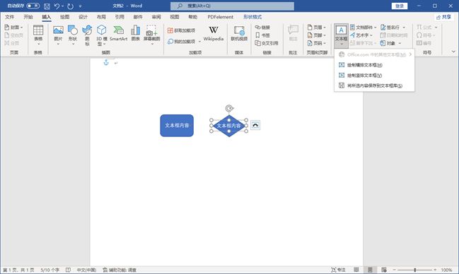 3、如果你想用Word在流程圖形狀里面填寫文字,那么你需要從繪圖工具中拖出一個(gè)文本框,或者選中當(dāng)前形狀后右鍵選擇“添加文字”。