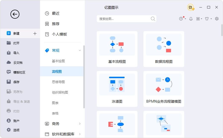 1、在“新建”頁(yè)面中,你可以看到“流程圖”分類。雙擊其中的小類如“基本流程圖”,就可以創(chuàng)建相應(yīng)的空白畫布。