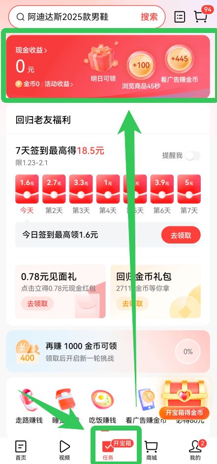 2、點(diǎn)擊【任務(wù)】,再點(diǎn)擊上方紅色區(qū)域的【現(xiàn)金收益】。