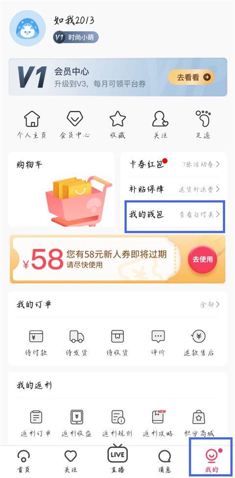 1、打開蘑菇街app,進入【我的】界面,點擊【我的錢包】。
