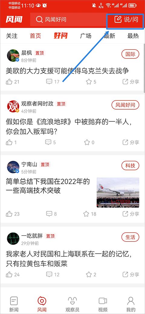 1、打開觀察者網(wǎng)app,在風(fēng)聞界面中點擊右上角說/問功能。