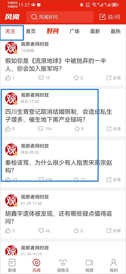 3、關(guān)注后的作者可以在風(fēng)聞界面中的關(guān)注中查看他發(fā)布的文章。