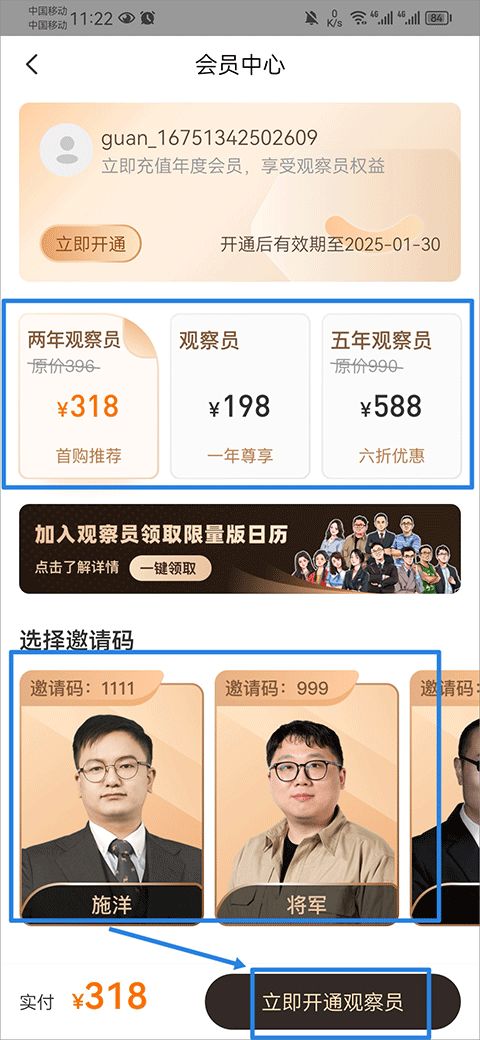 2、進(jìn)入后按照自己的需求進(jìn)行開通即可成為觀察員,另外選擇邀請碼后還可為你減少一定金額優(yōu)惠哦。