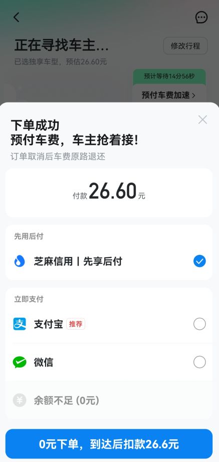 5、回到選車界面再次點(diǎn)擊【預(yù)約順風(fēng)車】就會(huì)跳轉(zhuǎn)到付錢頁(yè)面。付完錢就成功預(yù)約了。