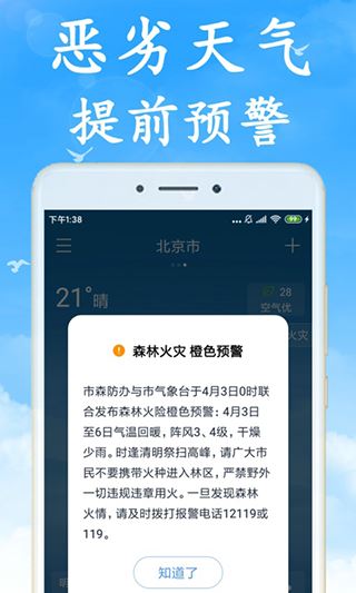 提供天氣預(yù)警的功能,直接通過發(fā)送天氣預(yù)警提醒消息的方式,提醒您安全出行;