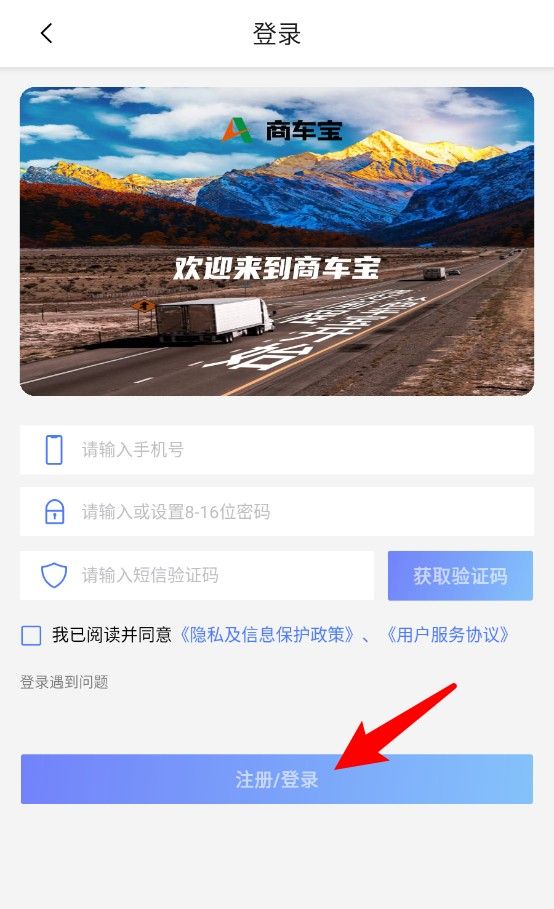 1.打開商車寶App后,輸入手機號、密碼及驗證碼,點擊底部“注冊/登錄”按鈕完成登錄操作。
