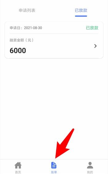 3.點擊底部“賬單”按鈕,可查看已申請的貸款狀態(tài)及放款金額等詳細記錄。