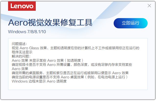 Aero視覺效果修復工具是由聯(lián)想官方推出的一款電腦系統(tǒng)修復工具,這款軟件可以輕松的幫助用戶檢測Windows系統(tǒng)的桌面設(shè)置Aero個性化,有需要的朋友可以下載使用。