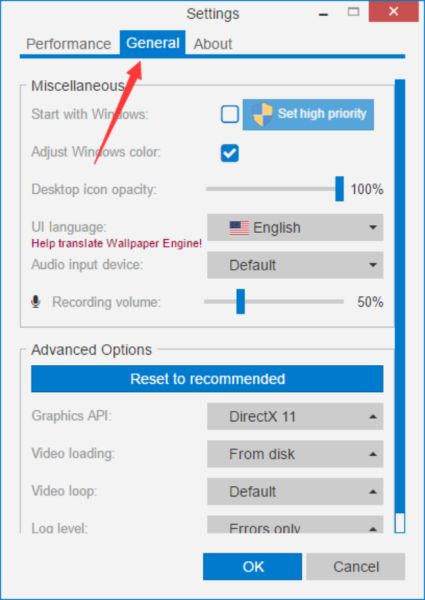 2、將設(shè)置窗口切換到“General”標簽頁下。