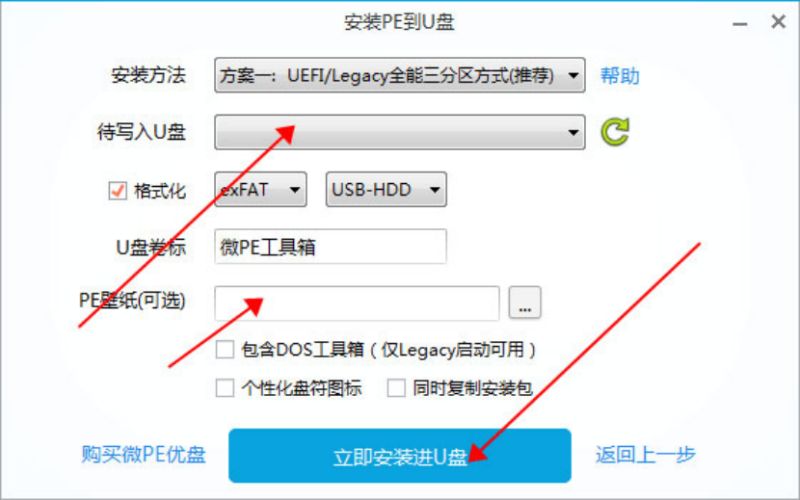 2、如圖,選擇你的U盤,接著選擇你喜歡的壁紙導入即可,隨后點擊立即安裝進U盤,等待安裝完畢,這樣把成功把微pe工具箱裝進了U盤啦。
