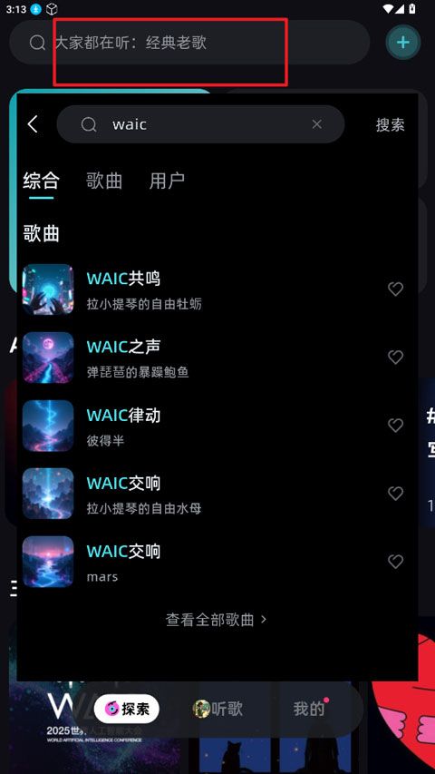 2、可根據(jù)分類或直接搜索自己喜歡的歌曲,還能使用ai創(chuàng)作歌曲。