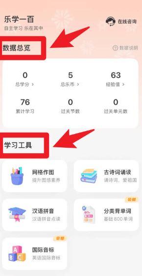 3、在此界面的數(shù)據(jù)總覽區(qū)域,可以直觀查看總學(xué)分、累計(jì)學(xué)習(xí)和經(jīng)驗(yàn)值等學(xué)習(xí)成果,同時(shí)還能進(jìn)入學(xué)習(xí)工具模塊,使用拼音、作圖等功能。