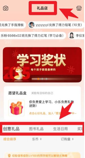 5、在禮品店頁面,用戶可使用樂幣兌換創(chuàng)意禮品、圖書或生活用品,還能查看兌換記錄,激勵(lì)學(xué)習(xí)積極性。