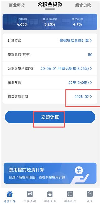 5、最后選擇自己的首次還款時(shí)間,點(diǎn)擊【立即計(jì)算】。