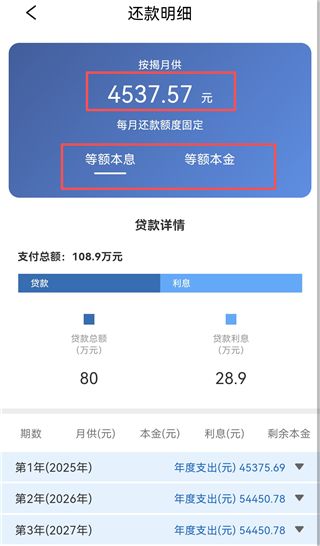 6、選擇等額本息或等額本金,用戶即可查看每月月供。