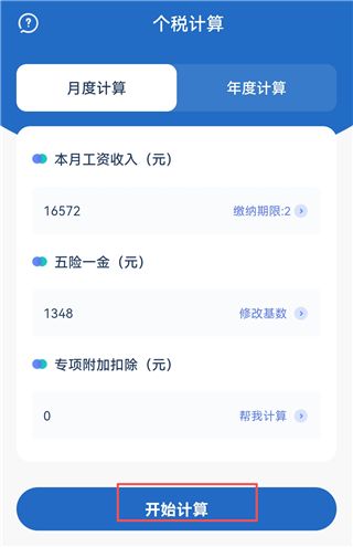 2、以年度計(jì)算為例,輸入本月的工資、五險(xiǎn)一金中的個(gè)人繳納部分以及專項(xiàng)附加扣除金額,點(diǎn)擊【開(kāi)始計(jì)算】。