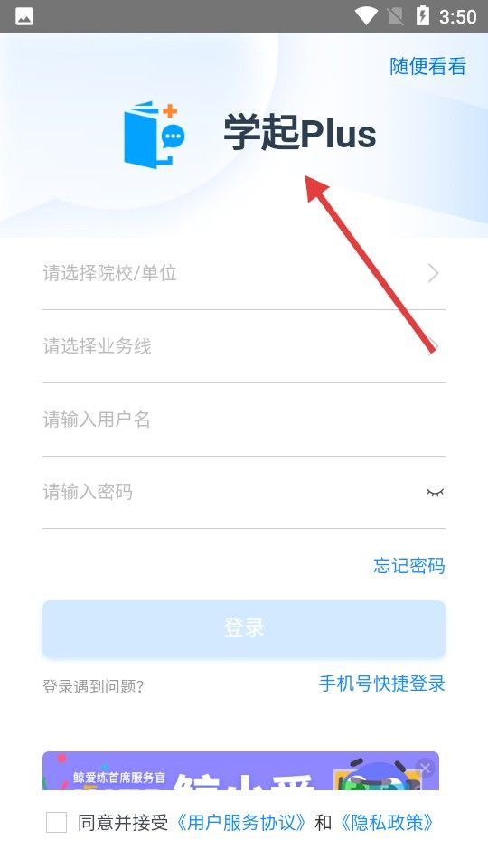 1、學(xué)起Plus登錄頁需選院校單位與業(yè)務(wù)線,填用戶名和密碼登錄,支持手機(jī)號(hào)快捷登錄,下方有隱私協(xié)議相關(guān)提示。