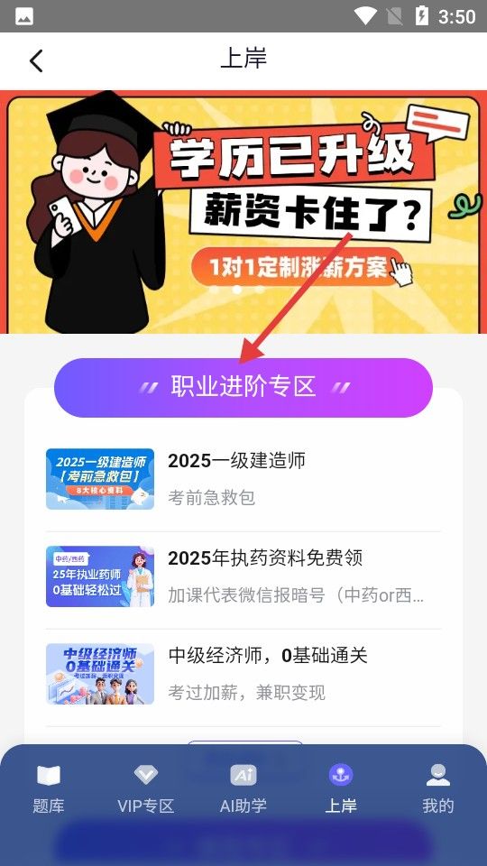 2、應(yīng)用上岸頁面的職業(yè)進(jìn)階專區(qū)展示2025一級(jí)建造師等考前資料,還有執(zhí)業(yè)藥師、中級(jí)經(jīng)濟(jì)師備考內(nèi)容。