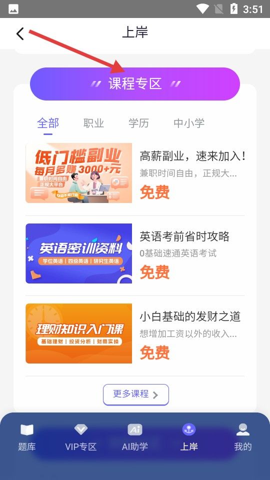 3、上岸的課程專區(qū)含職業(yè)、學(xué)歷等類別課程,有低門檻副業(yè)、英語密訓(xùn)、理財(cái)入門等免費(fèi)課程,可點(diǎn)擊查看更多。