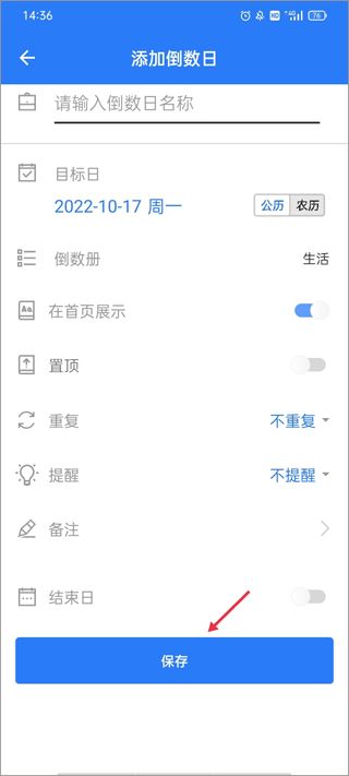 2、輸入倒數(shù)日名稱,設(shè)置時間、提醒等,點擊保存之后就可以在頁面上顯示了。