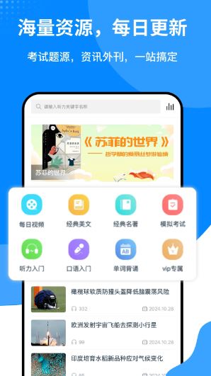 2、豐富的資源:每天更新大量的聽(tīng)力材料,涵蓋新聞、故事和真實(shí)考試問(wèn)題等各種類型。