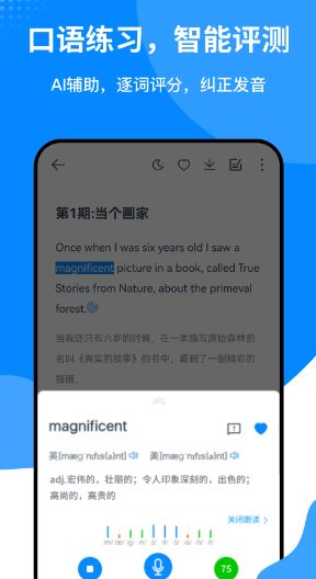 2、可以錄音,可以在練習(xí)英語(yǔ)句子的時(shí)候,點(diǎn)擊跟讀,將自己讀的和原文對(duì)比,糾正發(fā)音;