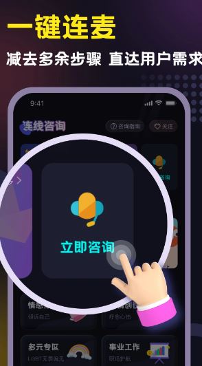 3、可以讓你快速的與平臺(tái)的咨詢師進(jìn)行連線,幫助用戶快速咨詢相關(guān)的問(wèn)題。