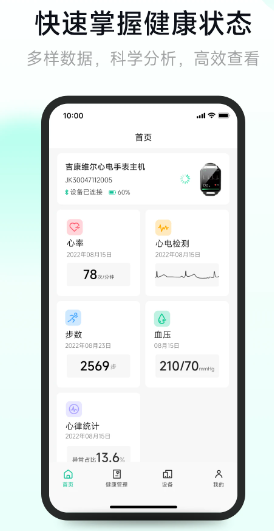 吉康護(hù)心app是一款簡(jiǎn)單、易操作的心電監(jiān)測(cè)應(yīng)用軟件,軟件支持用戶在線對(duì)智能硬件設(shè)備進(jìn)行連接,實(shí)時(shí)的采集心電信號(hào),在這里用戶可以隨時(shí)隨地的測(cè)量自己的心電,方便用戶可以快速掌握自己的健康狀態(tài),一鍵對(duì)其進(jìn)行多樣數(shù)據(jù)的科學(xué)分析,高效的進(jìn)行查看。
