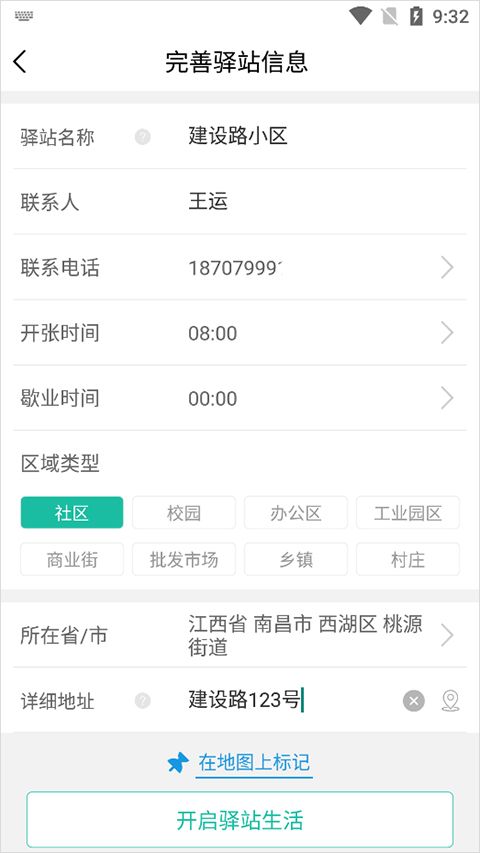 點擊之后就可以進入到完善驛站信息頁面了,在該頁面中輸入驛站名稱,聯(lián)系人,以及選擇營業(yè)時間,區(qū)域類型,還有填寫詳細地址后就可以點擊【開啟驛站生活】